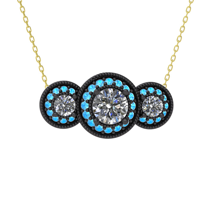 Swarovski ve akuamarin 925 ayar siyah rodyum kaplama gümüş kolye (40 cm altın rolo zincir)
