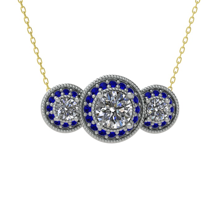 Swarovski ve lab safir 14 ayar beyaz altın kolye (40 cm gümüş rolo zincir)