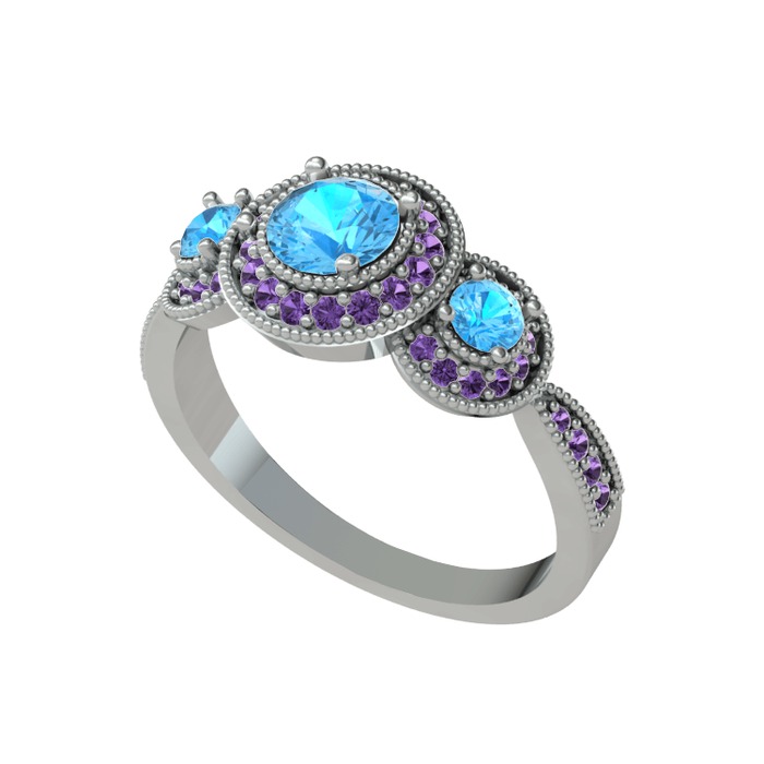Akuamarin ve ametist 18 ayar beyaz altın yüzük