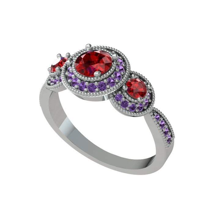 Garnet ve ametist 14 ayar beyaz altın yüzük