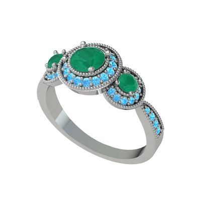 Kök zümrüt ve akuamarin 8 ayar beyaz altın yüzük