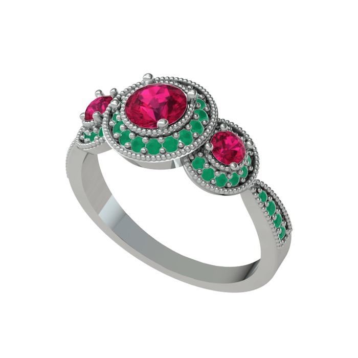 Rodolit garnet ve kök zümrüt 14 ayar beyaz altın yüzük