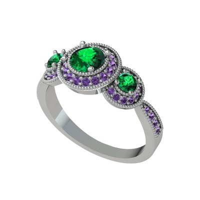Yeşil kuvars ve ametist 14 ayar beyaz altın yüzük