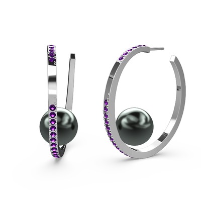 Siyah inci ve ametist 18 ayar beyaz altın küpe