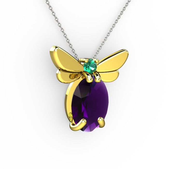 Ametist ve yeşil kuvars 14 ayar altın kolye (40 cm gümüş rolo zincir)
