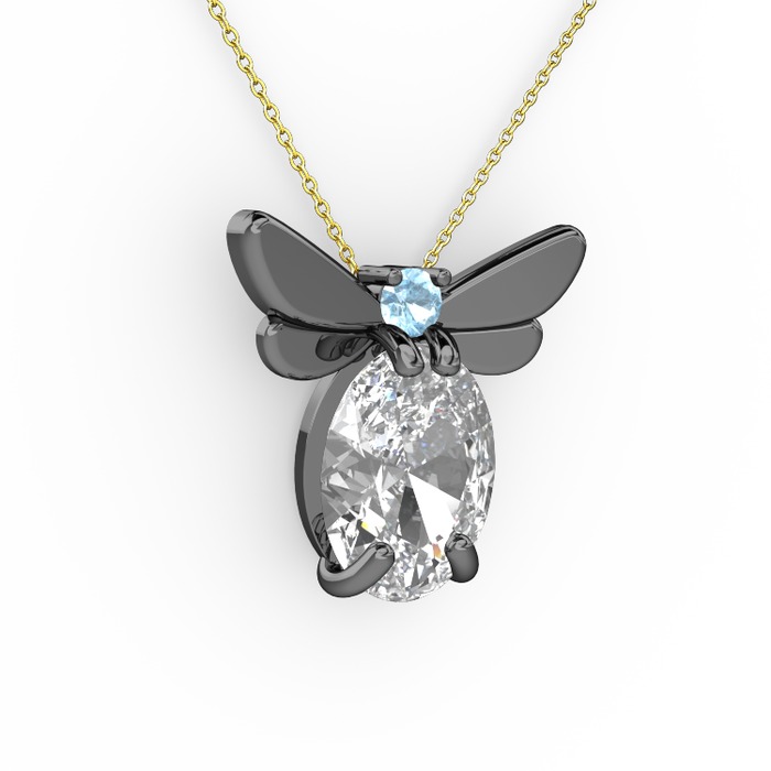 Beyaz zirkon ve akuamarin 925 ayar siyah rodyum kaplama gümüş kolye (40 cm altın rolo zincir)