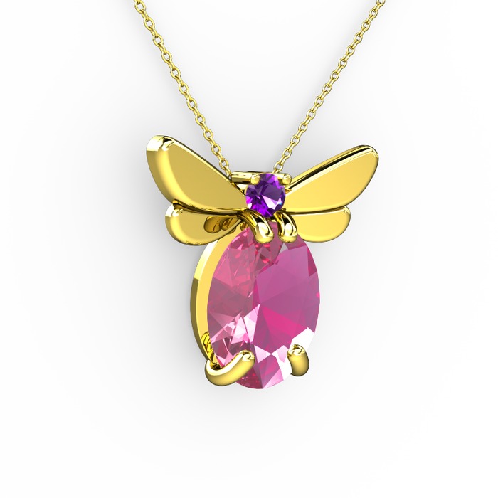 Pembe kuvars ve ametist 18 ayar altın kolye (40 cm altın rolo zincir)