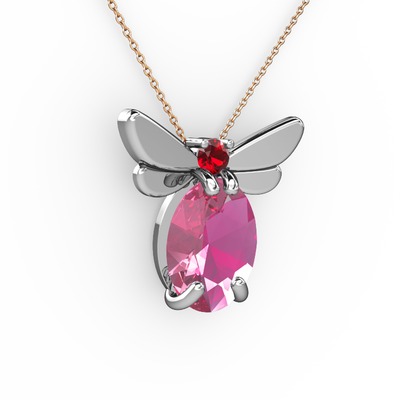 Pembe kuvars ve garnet 8 ayar beyaz altın kolye (40 cm rose altın rolo zincir)