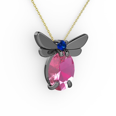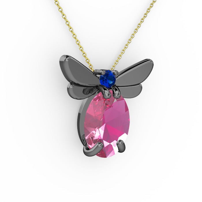 Pembe kuvars ve lab safir 925 ayar siyah rodyum kaplama gümüş kolye (40 cm altın rolo zincir)