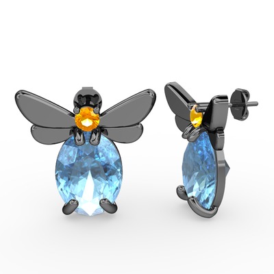 Akuamarin ve sitrin 925 ayar siyah rodyum kaplama gümüş küpe