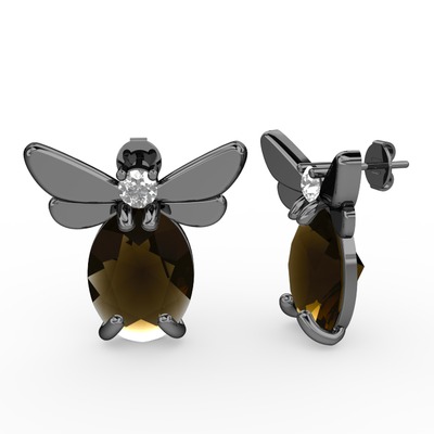 Dumanlı kuvars ve pırlanta 925 ayar siyah rodyum kaplama gümüş küpe (0.22 karat)