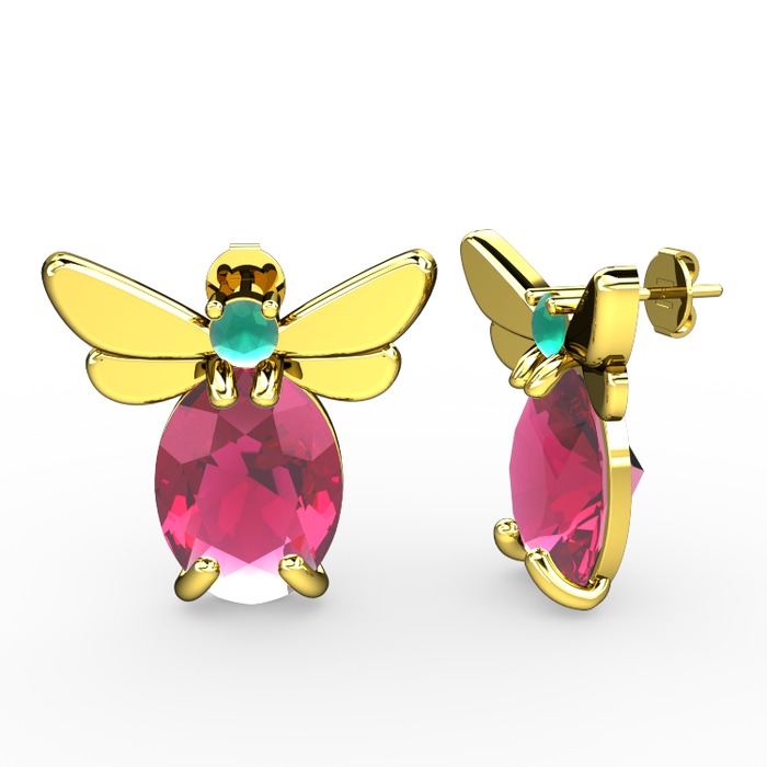 Pembe kuvars ve kök zümrüt 8 ayar altın küpe