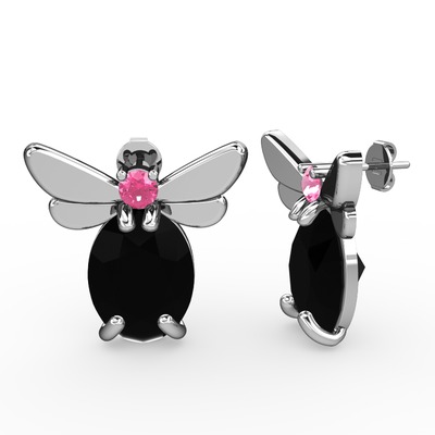 Siyah zirkon ve pembe kuvars 18 ayar beyaz altın küpe
