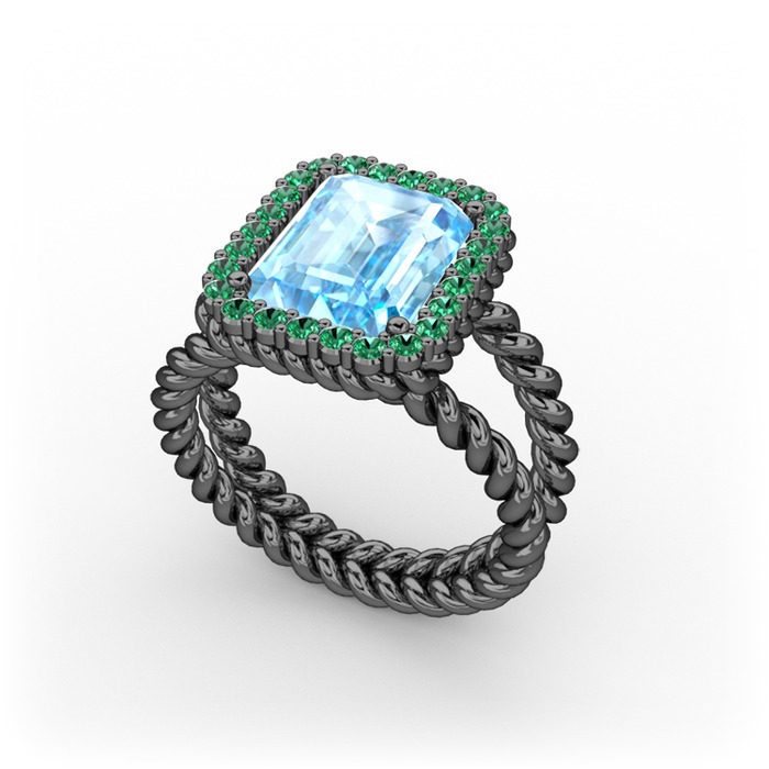 Akuamarin ve yeşil kuvars 925 ayar siyah rodyum kaplama gümüş yüzük
