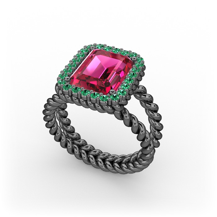 Rodolit garnet ve yeşil kuvars 925 ayar siyah rodyum kaplama gümüş yüzük