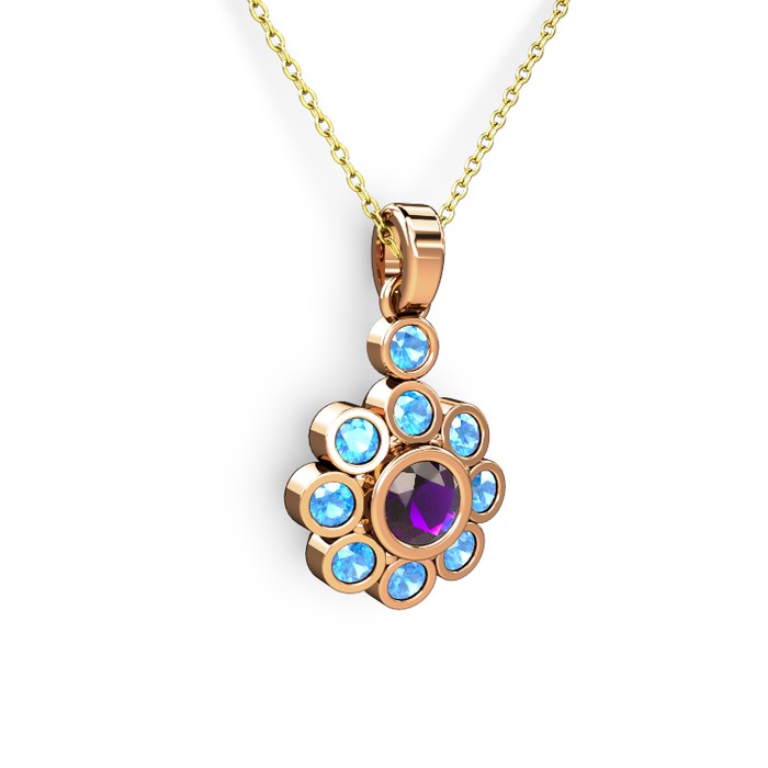 Akuamarin ve ametist 8 ayar rose altın kolye (40 cm gümüş rolo zincir)