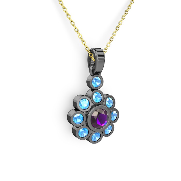 Akuamarin ve ametist 925 ayar siyah rodyum kaplama gümüş kolye (40 cm altın rolo zincir)