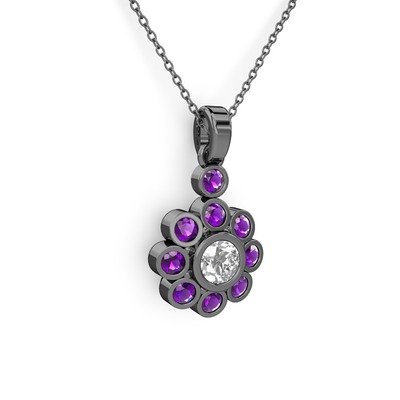 Ametist ve beyaz zirkon 925 ayar siyah rodyum kaplama gümüş kolye (40 cm gümüş rolo zincir)