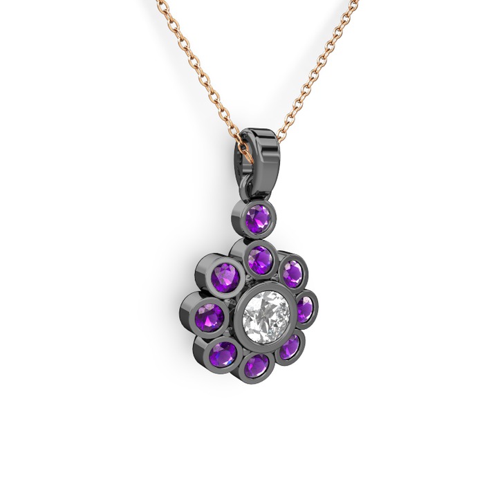 Ametist ve beyaz zirkon 925 ayar siyah rodyum kaplama gümüş kolye (40 cm rose altın rolo zincir)