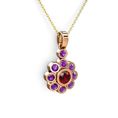 Ametist ve garnet 8 ayar rose altın kolye (40 cm gümüş rolo zincir)