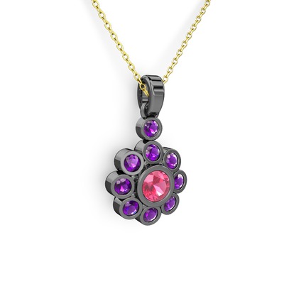 Ametist ve pembe kuvars 925 ayar siyah rodyum kaplama gümüş kolye (40 cm altın rolo zincir)