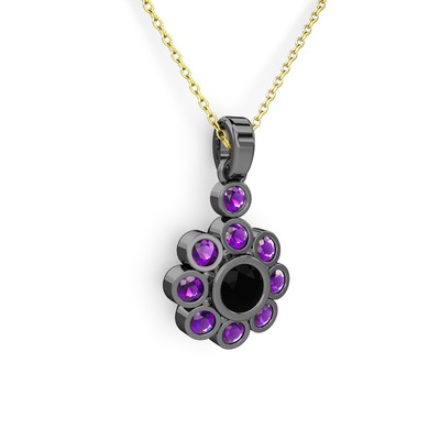 Ametist ve siyah zirkon 925 ayar siyah rodyum kaplama gümüş kolye (40 cm altın rolo zincir)