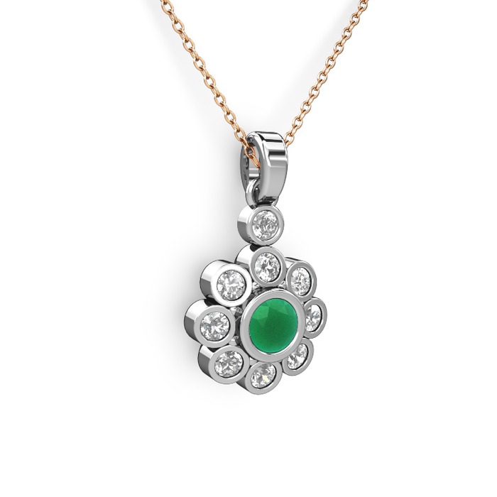 Elmas ve kök zümrüt 8 ayar beyaz altın kolye (0.54 karat, 40 cm rose altın rolo zincir)
