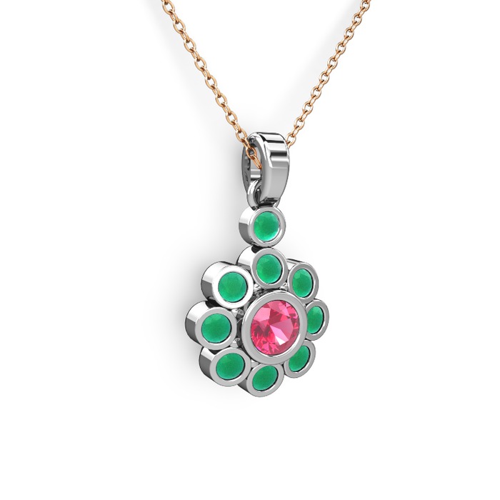 Kök zümrüt ve pembe kuvars 18 ayar beyaz altın kolye (40 cm rose altın rolo zincir)