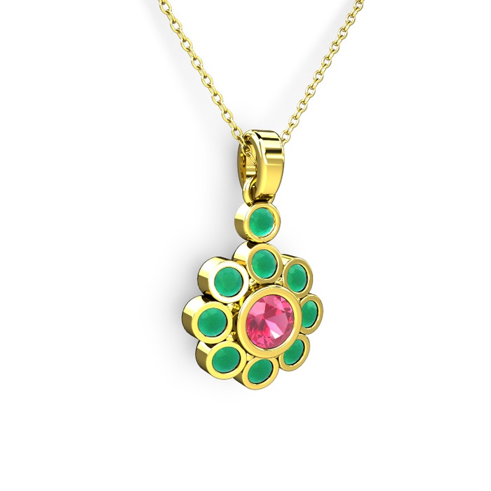 Kök zümrüt ve pembe kuvars 925 ayar altın kaplama gümüş kolye (40 cm altın rolo zincir)