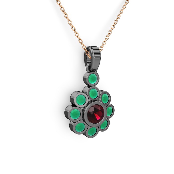 Kök zümrüt ve rodolit garnet 925 ayar siyah rodyum kaplama gümüş kolye (40 cm rose altın rolo zincir)