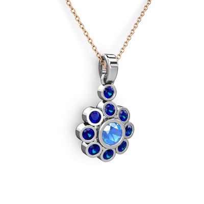 Lab safir ve akuamarin 8 ayar beyaz altın kolye (40 cm rose altın rolo zincir)