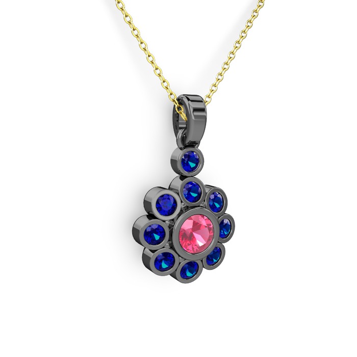 Lab safir ve pembe kuvars 925 ayar siyah rodyum kaplama gümüş kolye (40 cm altın rolo zincir)