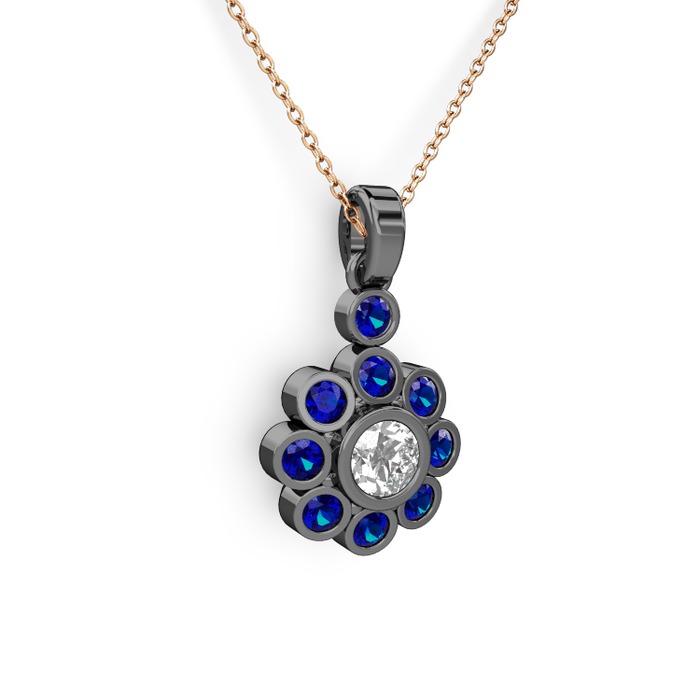 Lab safir ve pırlanta 925 ayar siyah rodyum kaplama gümüş kolye (0.5 karat, 40 cm gümüş rolo zincir)