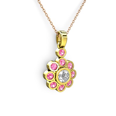 Pembe kuvars ve elmas 8 ayar altın kolye (0.5 karat, 40 cm rose altın rolo zincir)