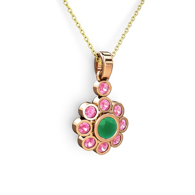Pembe kuvars ve kök zümrüt 14 ayar rose altın kolye (40 cm gümüş rolo zincir)