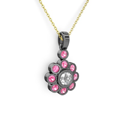 Pembe kuvars ve swarovski 925 ayar siyah rodyum kaplama gümüş kolye (40 cm altın rolo zincir)