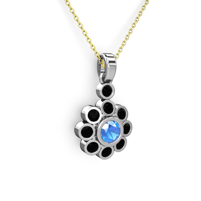 Siyah zirkon ve akuamarin 8 ayar beyaz altın kolye (40 cm gümüş rolo zincir)