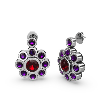 Ametist ve garnet 8 ayar beyaz altın küpe