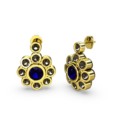 Dumanlı kuvars ve lab safir 18 ayar altın küpe