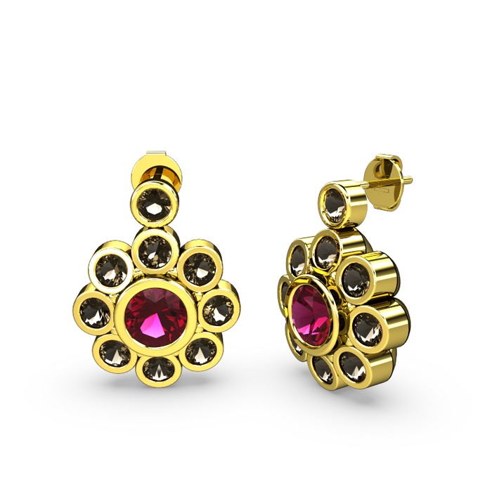 Dumanlı kuvars ve rodolit garnet 14 ayar altın küpe