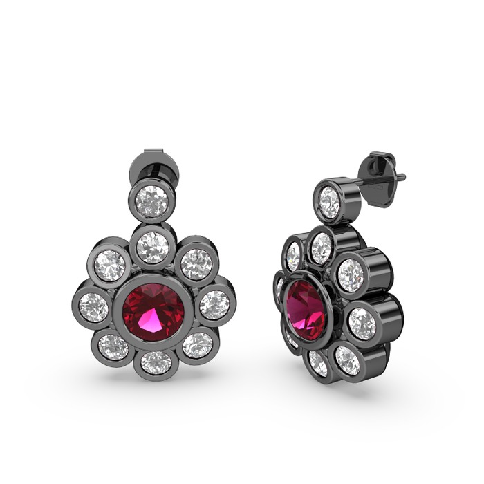 Elmas ve rodolit garnet 925 ayar siyah rodyum kaplama gümüş küpe (1 karat)