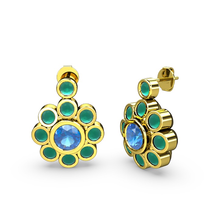 Kök zümrüt ve akuamarin 18 ayar altın küpe