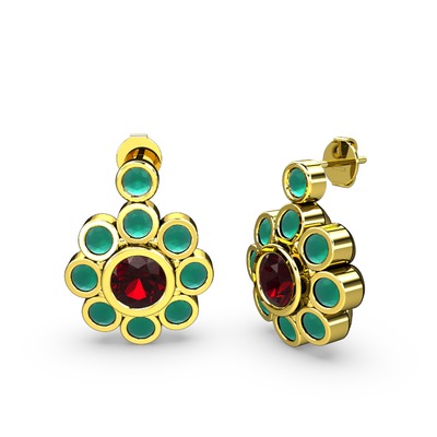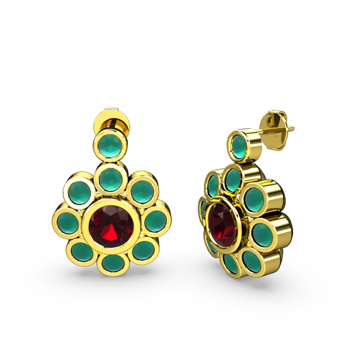 Kök zümrüt ve garnet 14 ayar altın küpe