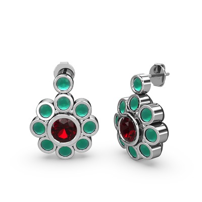 Kök zümrüt ve garnet 14 ayar beyaz altın küpe