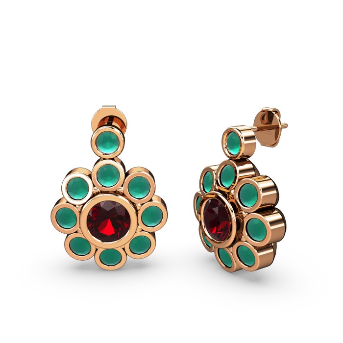 Kök zümrüt ve garnet 18 ayar rose altın küpe
