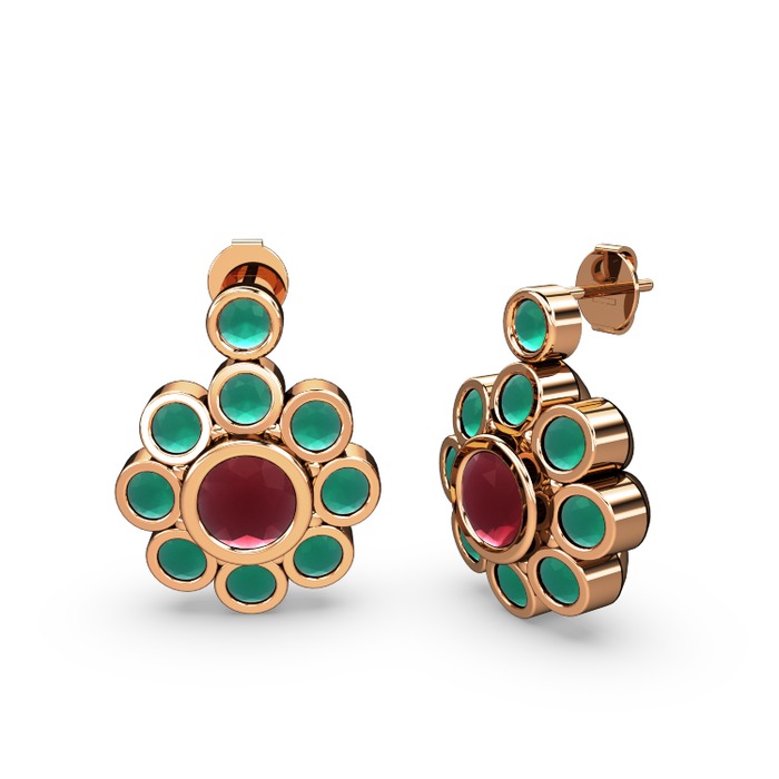 Kök zümrüt ve kök yakut 14 ayar rose altın küpe
