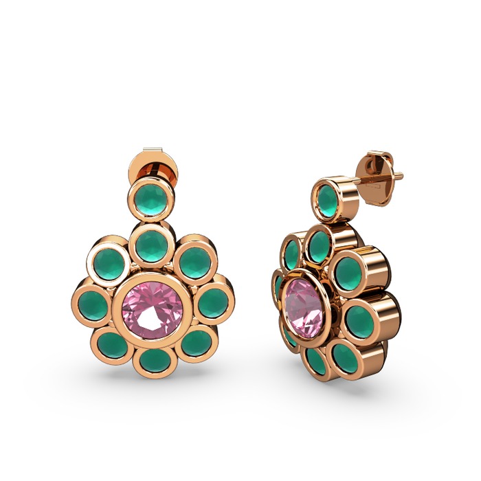 Kök zümrüt ve pembe kuvars 18 ayar rose altın küpe