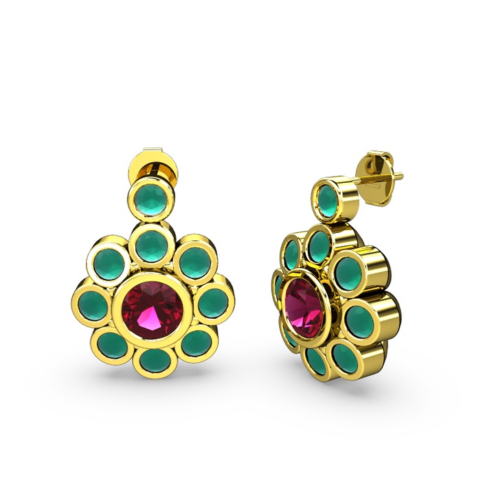 Kök zümrüt ve rodolit garnet 8 ayar altın küpe