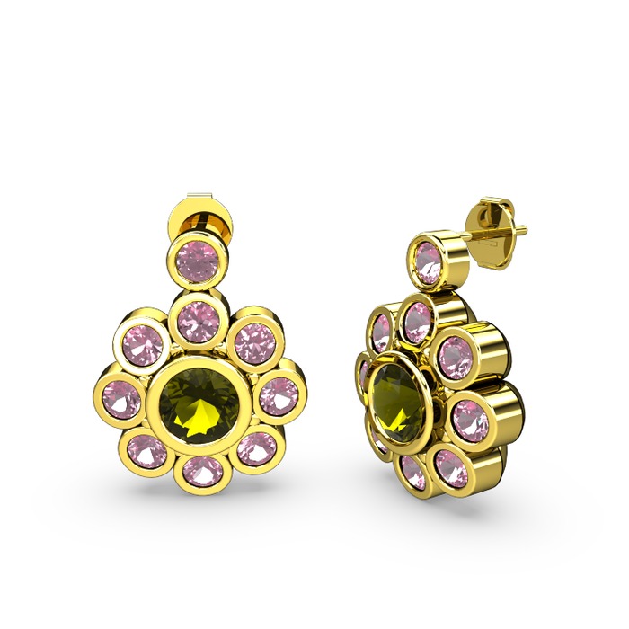 Pembe kuvars ve peridot 14 ayar altın küpe