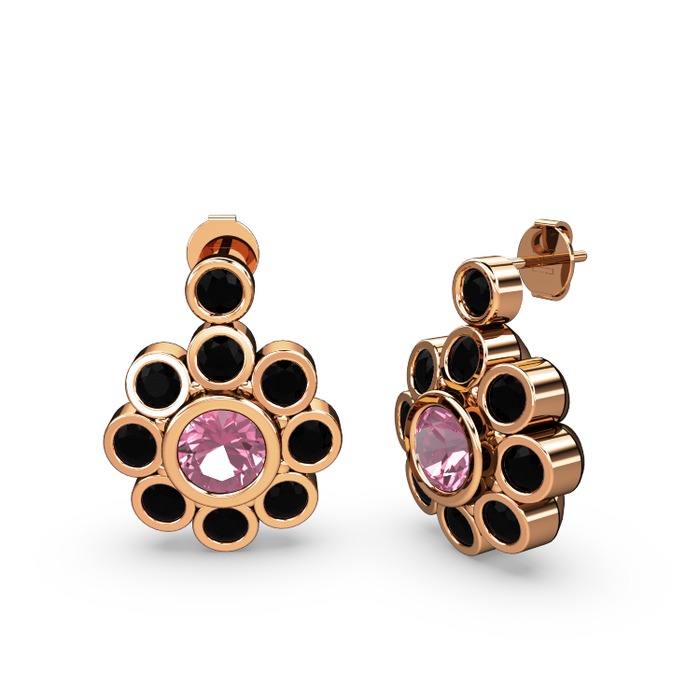 Siyah zirkon ve pembe kuvars 18 ayar rose altın küpe